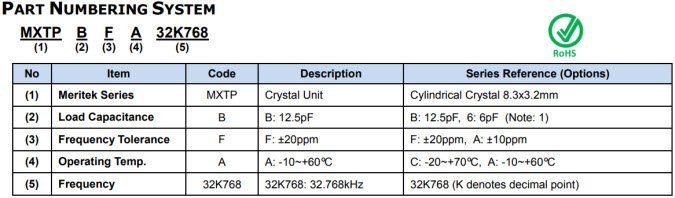 32.768 kHz +/-20ppm Crystal 6pF 30Kohm 8.3×3.2mm diameter, Fund.